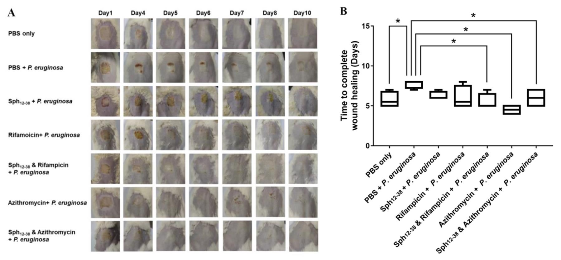 图2. Sph12-38、阿奇霉素和利福平单独处理以及Sph12-38分别与阿奇霉素和利福平协同使用对感染铜绿假单胞菌的小鼠背部伤口有显著的促进愈合作用(Liu J, et al., 2020)