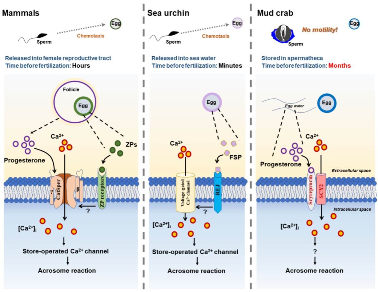 图3(原图Fig.8, Fig.9). Scyreprocin与SCY2 在青蟹精子顶体反应中的作用概图(上图示); 哺乳动物、海胆与青蟹三种动物精子顶体反应的机制简要比较(下图示)(Figure 8. Roles of scyreprocin and SCY2 in the sperm acrosome reaction (AR) of Scylla paramamosain. Figure 9. Brief comparison of sperm acrosome reaction (AR) mechanism in mammals, sea urchin, and mud crab. )