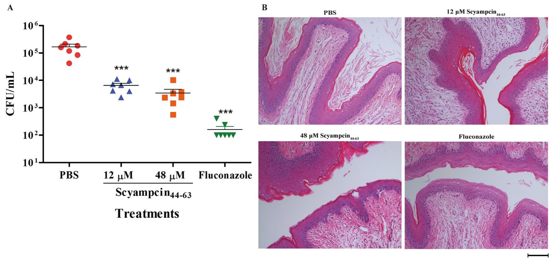 基于Scyampcin44-63在体外具有很强的抗念珠菌活性,利用小鼠念珠菌性阴道炎模型,探索了Scyampcin44-63在动物体内的疗效,并以临床常用药物氟康唑作为阳性对照。与阳性对照结果一致,Scyampcin44-63可显著降低小鼠阴道灌洗液中的真菌载量,且菌丝量少于感染组(PBS处理)。